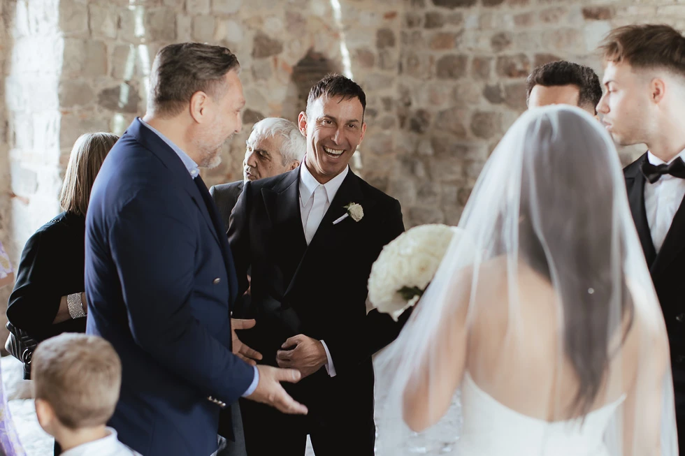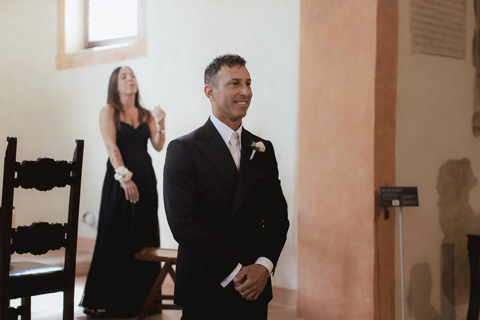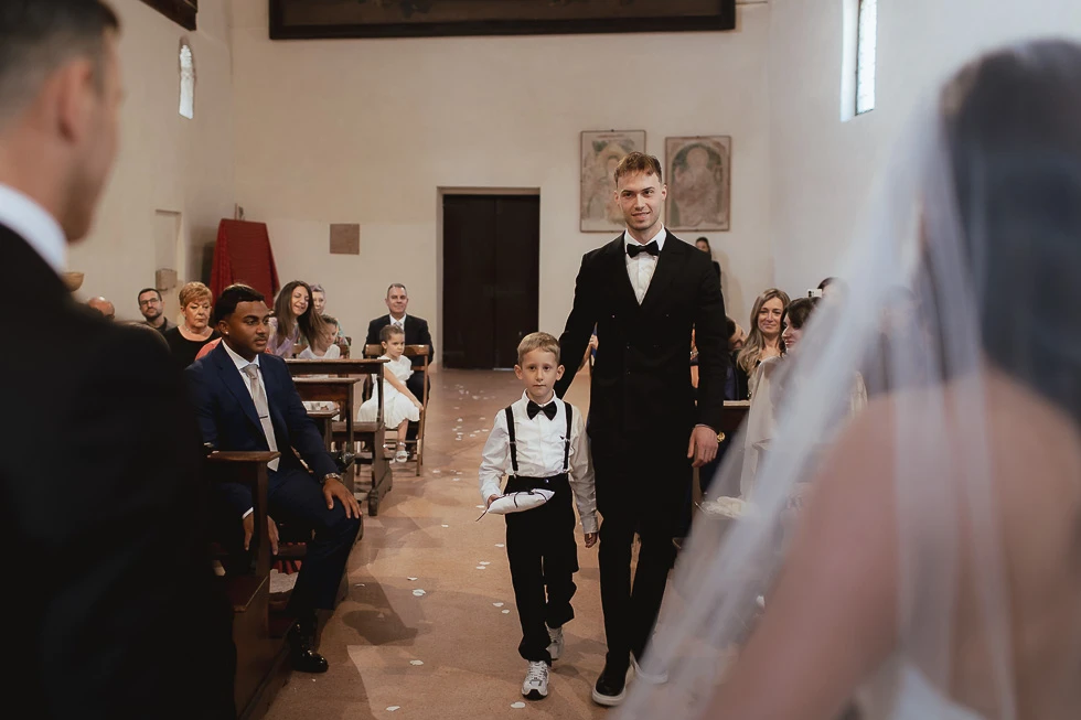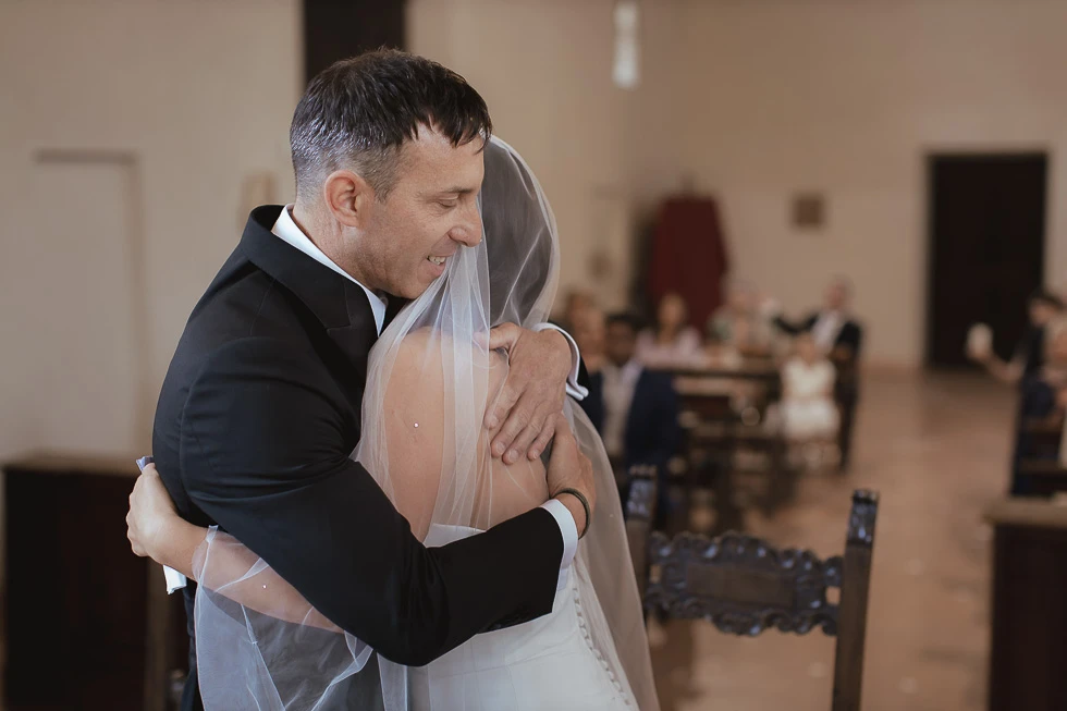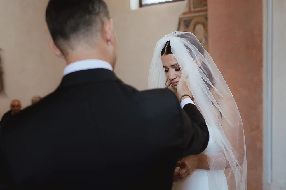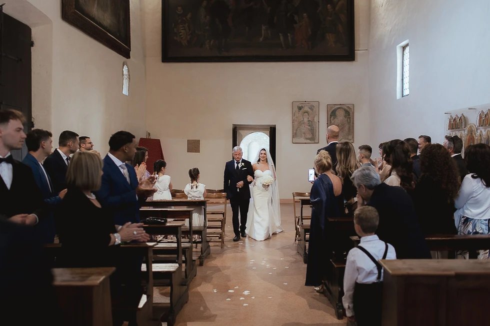 La cerimonia si è svolta all’Oratorio della Santissima Trinità ad Arquà Petrarca, un luogo che ha qualcosa di profondamente evocativo. Le sue pareti raccontano storie antiche e, quel giorno, hanno accolto una nuova promessa. La luce filtrava da una finestra, disegnando l’oratorio con un’atmosfera quasi fiabesca, fatta di chiaroscuri delicati e silenzi carichi di emozione.