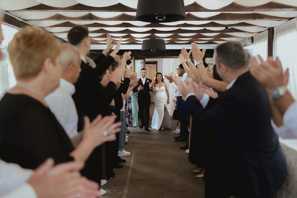 Dopo la cerimonia ci siamo spostati per il ricevimento a la Montanella, ad Arquà Petrarca. Un luogo che accoglie con naturale eleganza. La sala era curata nei dettagli: tavoli allestiti con ortensie e rose bianche, portacandele in vetro intagliato che diffondevano una luce calda, creando un’atmosfera raffinata. Tutto contribuiva a far sentire gli ospiti parte di qualcosa di sincero. Il pranzo è stato accompagnato dal calore degli invitati, da sorrisi condivisi e da racconti che si intrecciavano tra i tavoli. Con il passare delle ore, la musica ha preso spazio e la giornata ha cambiato ritmo, trasformandosi in festa, tra balli e risate spontanee.