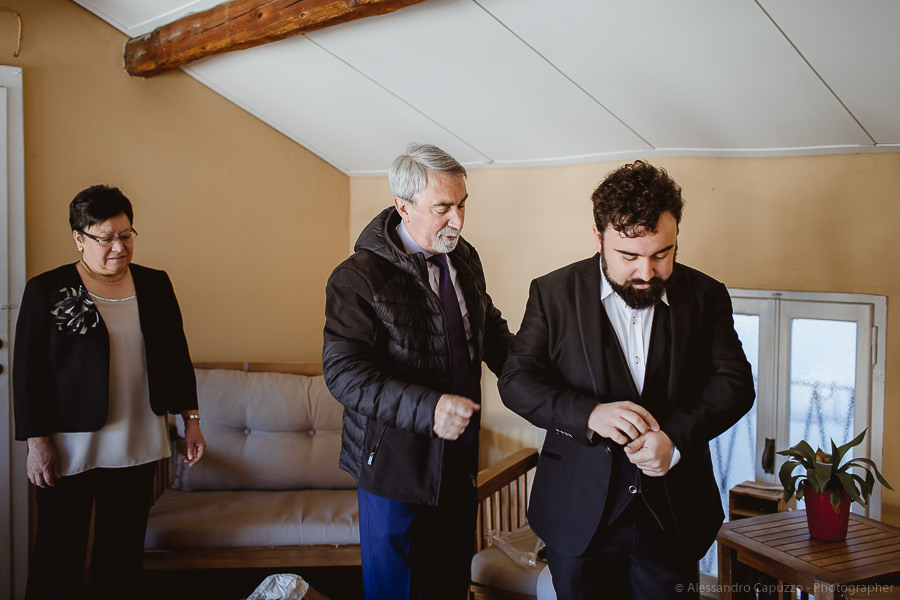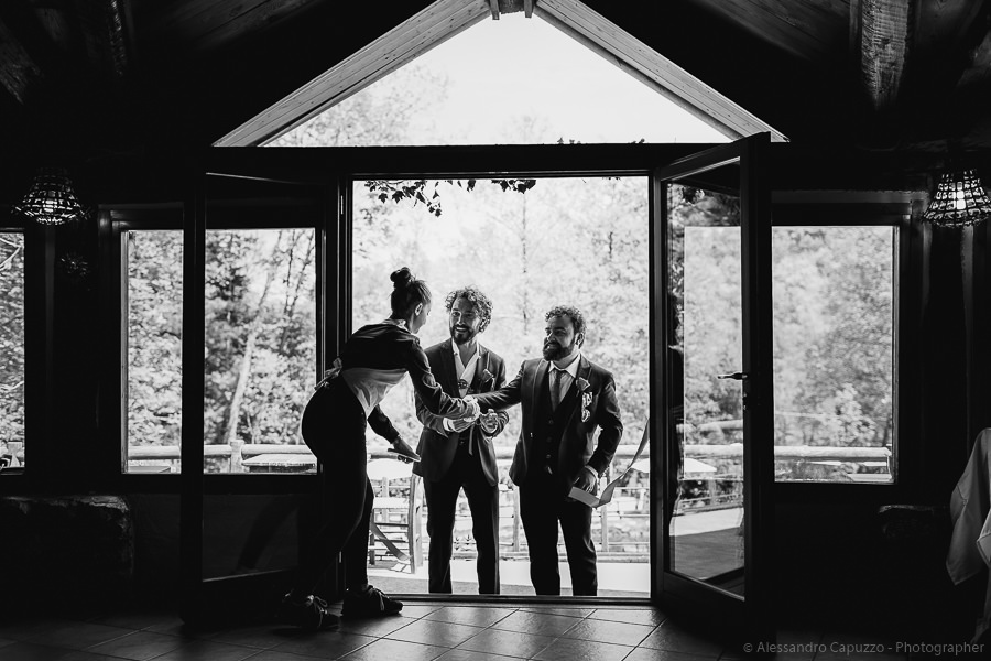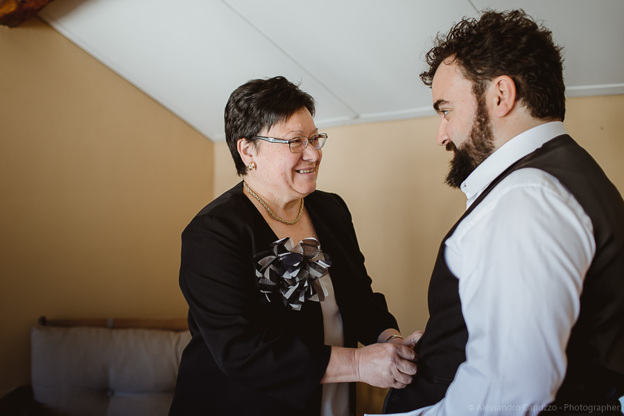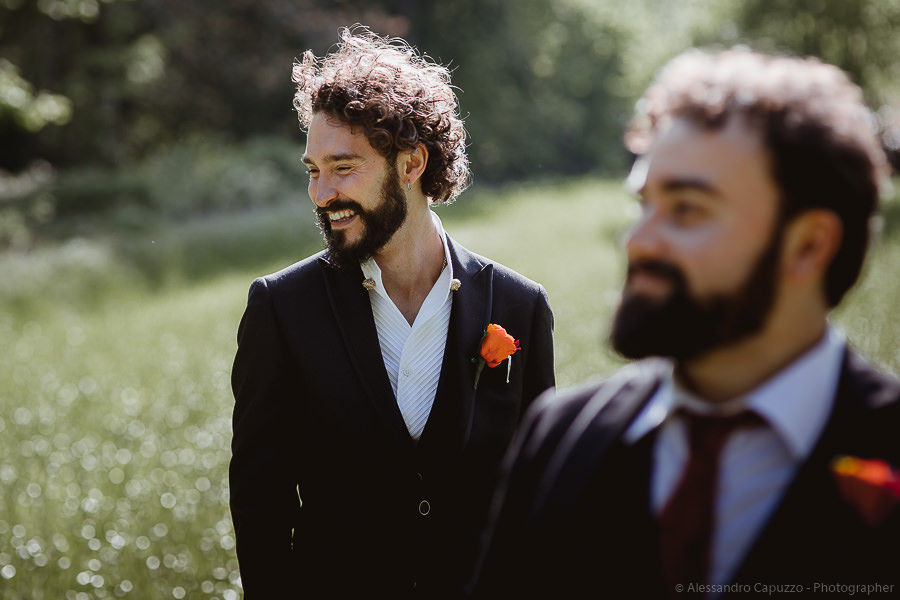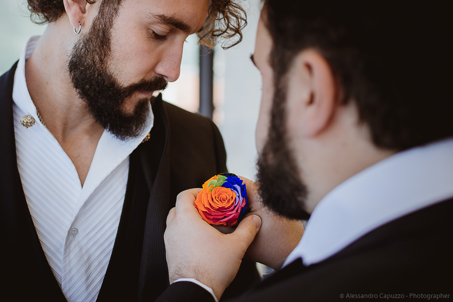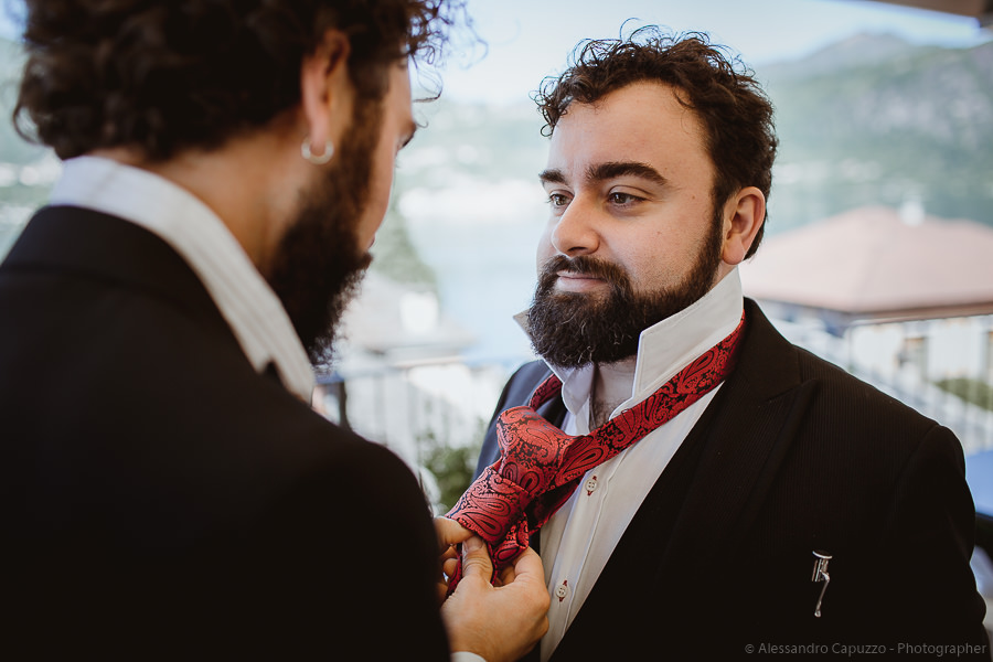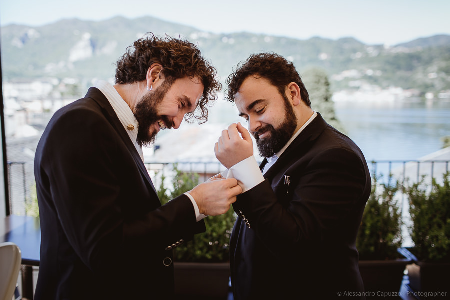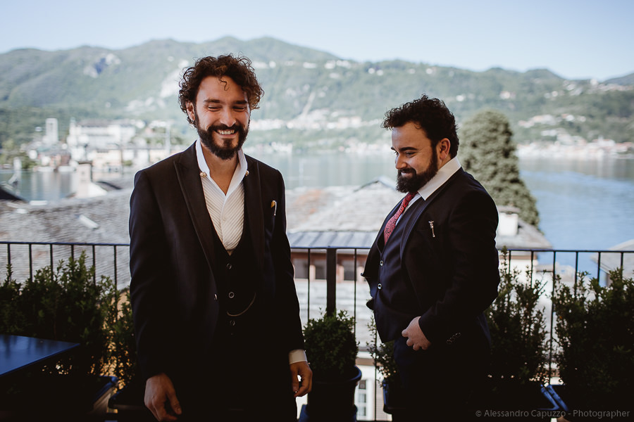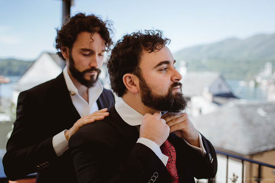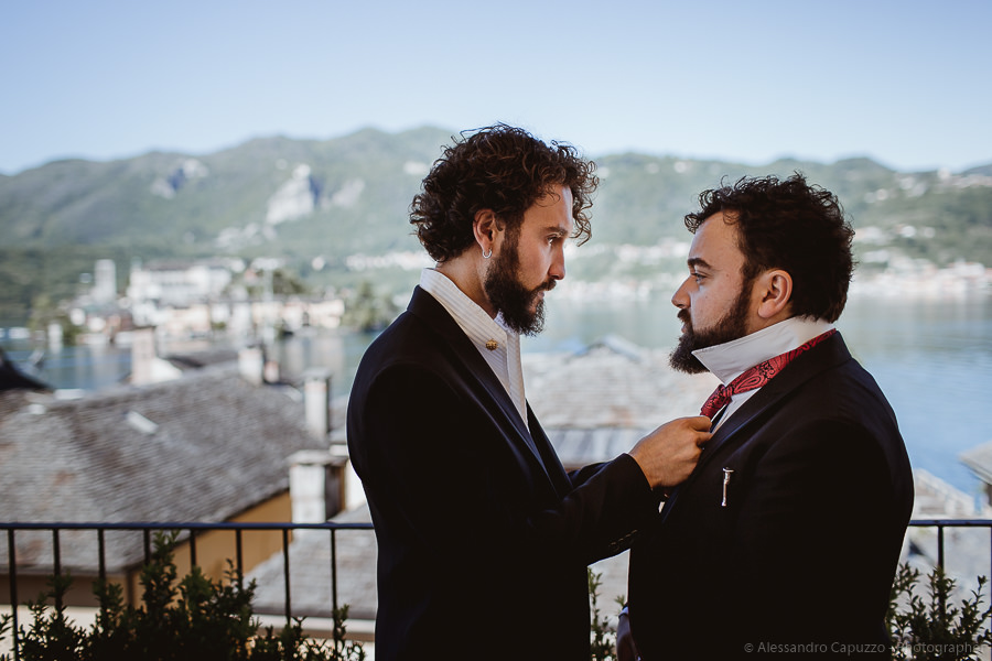The couple is staying at Locanda di Orta and both men are together with their loved ones while getting ready. Luca is jolly, lively and always ready for a smile or a genuine laugh. With him are his parents, his sister and his cousin. Tiziano’s parents are in turn helping their son to get ready. Unlike Luca, Tiziano is reserved and shy but his bright eyes speak for him, and despite it all, he is certainly not prepared to waive a touch of transgression: wearing sneakers!