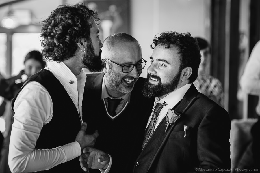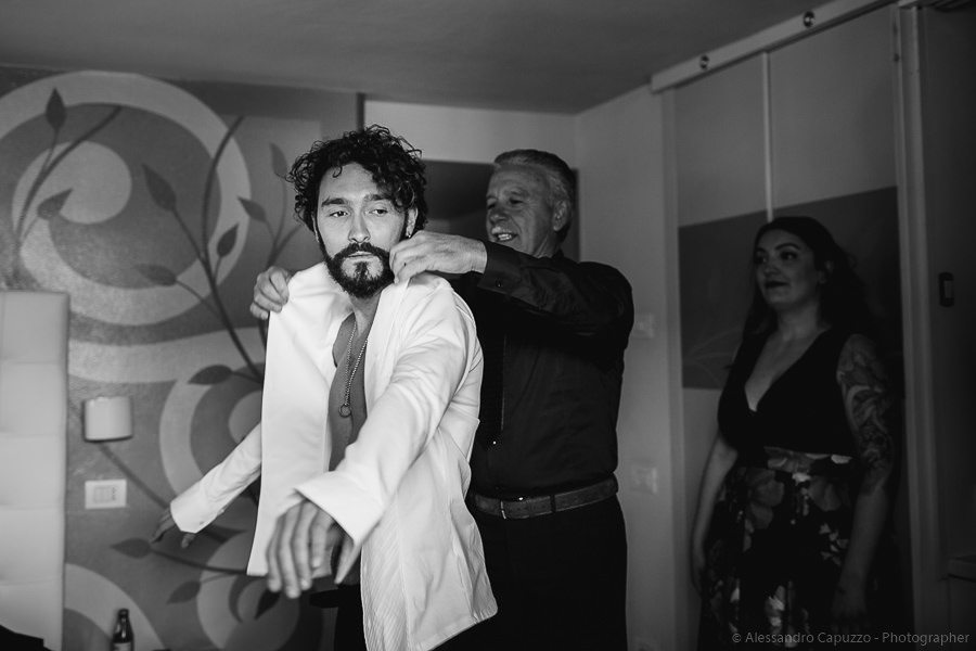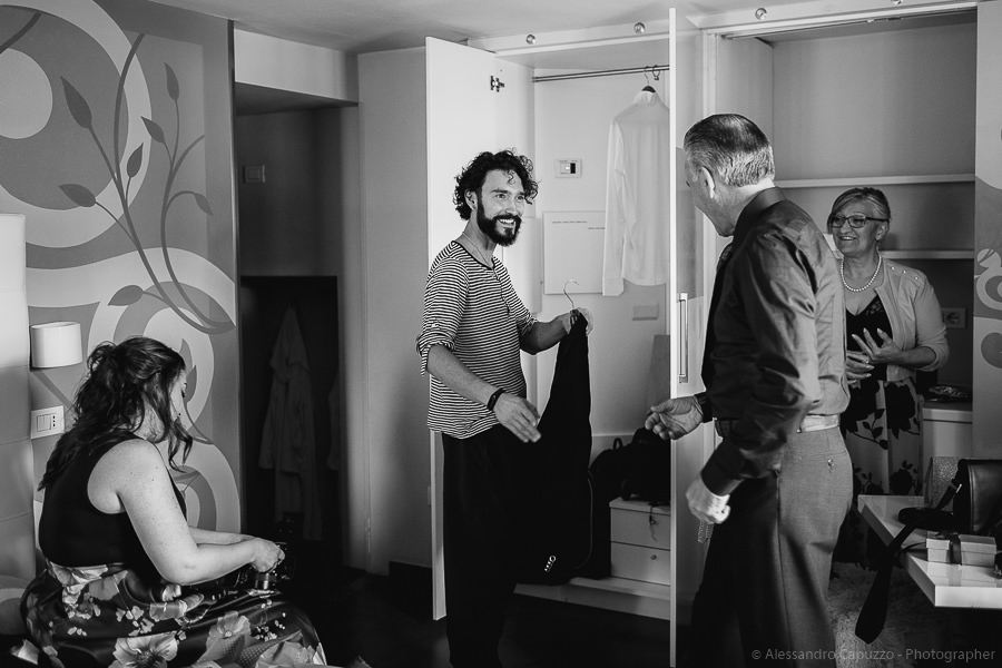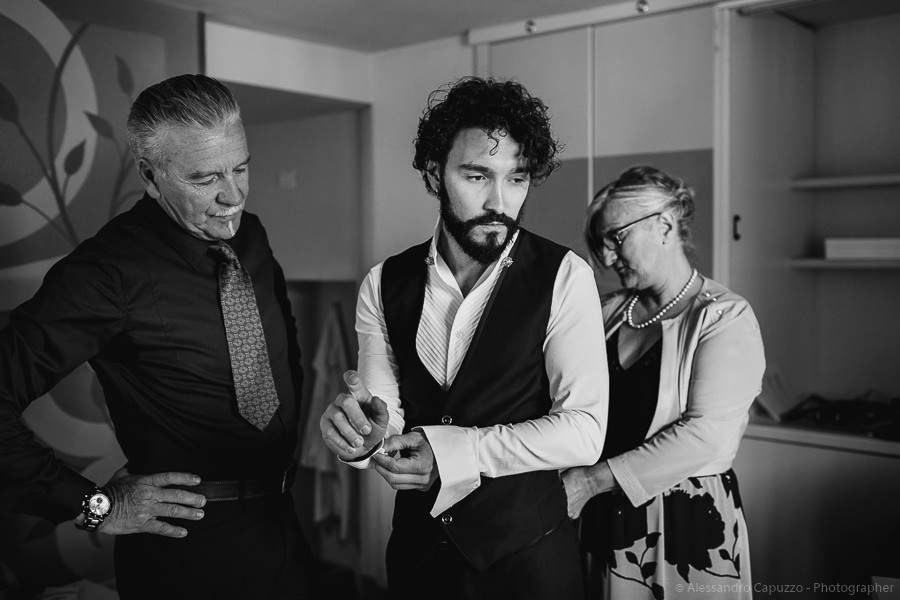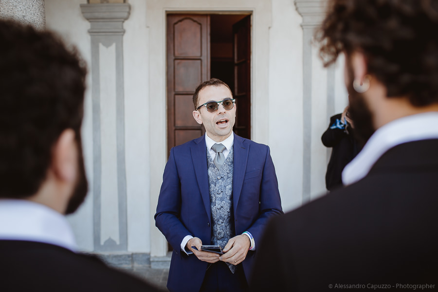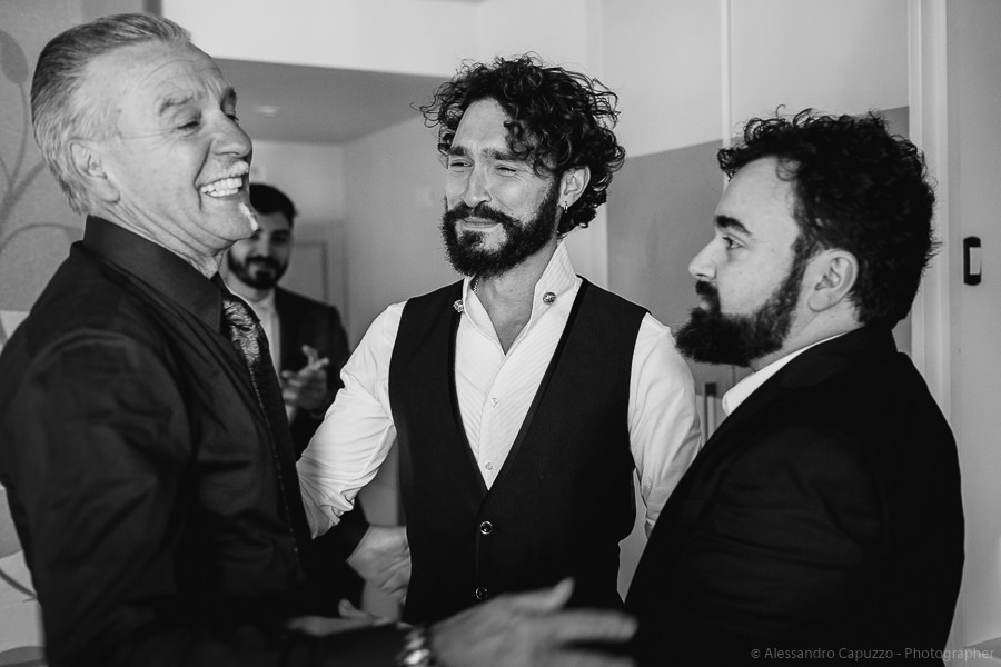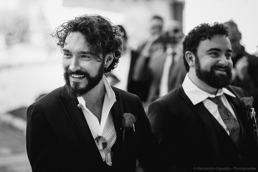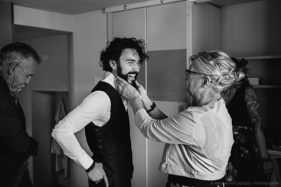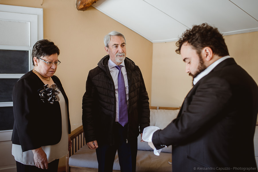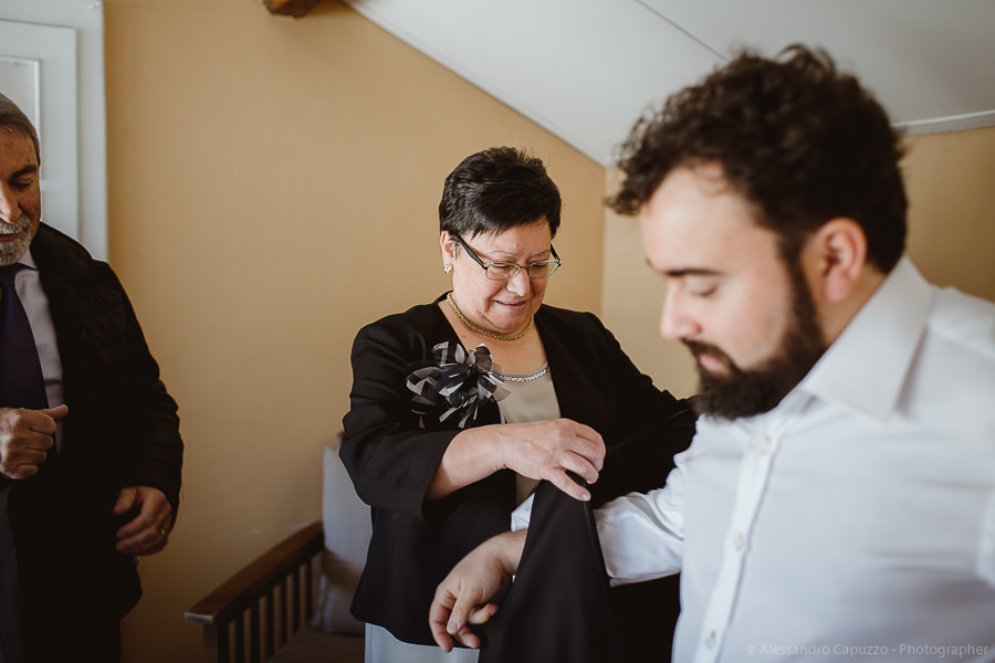 The couple is staying at Locanda di Orta and both men are together with their loved ones while getting ready. Luca is jolly, lively and always ready for a smile or a genuine laugh. With him are his parents, his sister and his cousin. Tiziano’s parents are in turn helping their son to get ready. Unlike Luca, Tiziano is reserved and shy but his bright eyes speak for him, and despite it all, he is certainly not prepared to waive a touch of transgression: wearing sneakers!