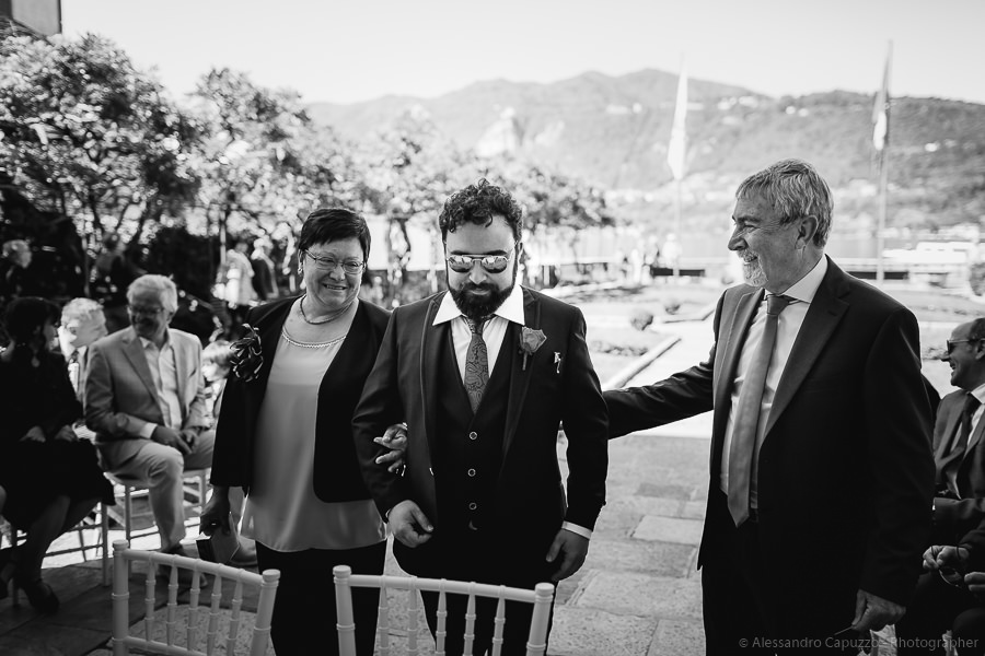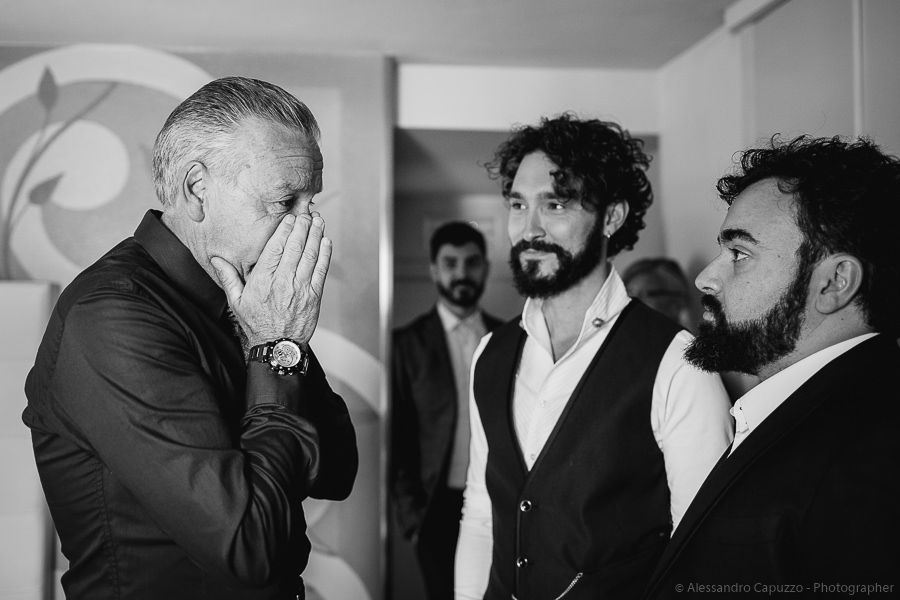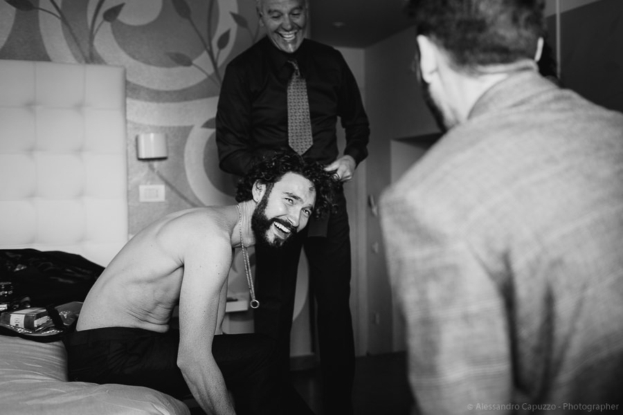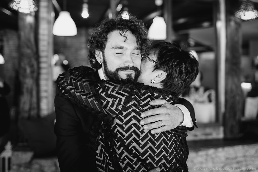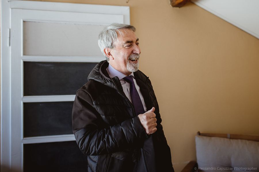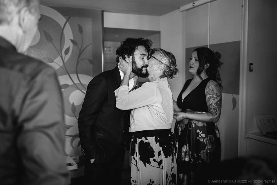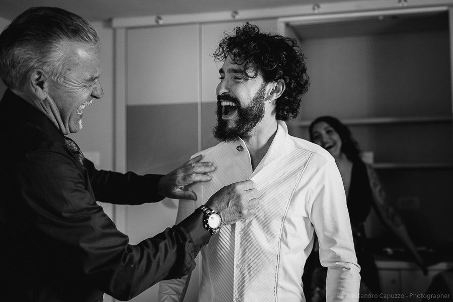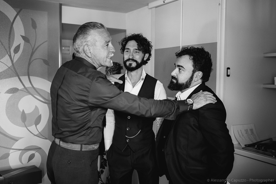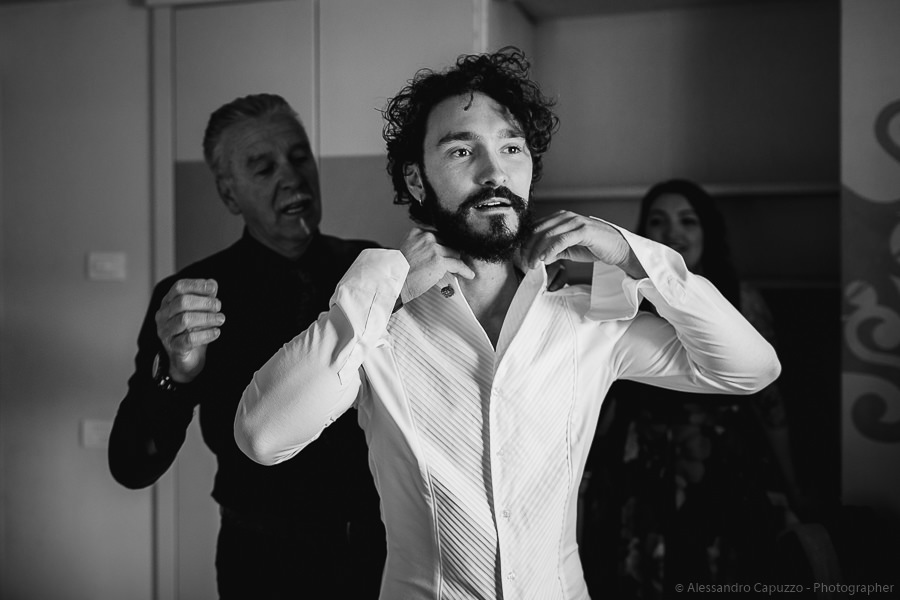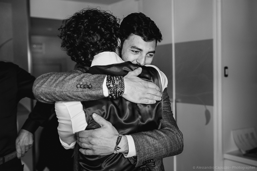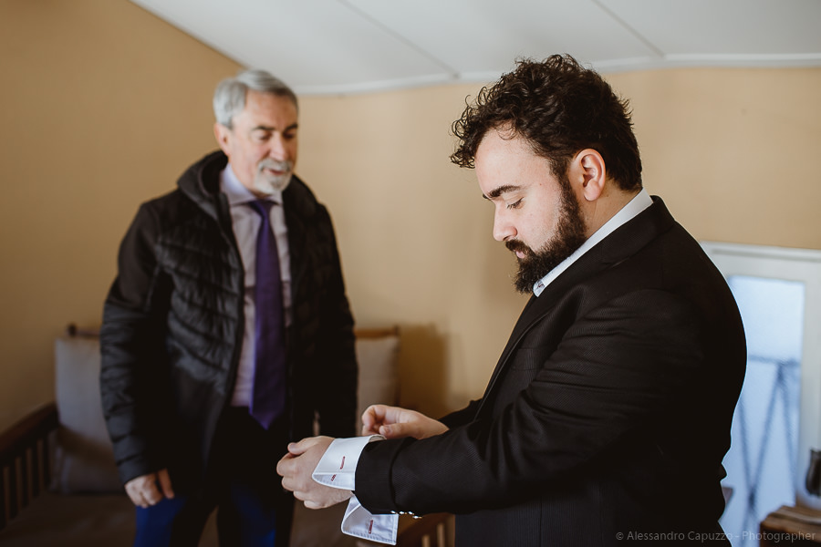 The couple is staying at Locanda di Orta and both men are together with their loved ones while getting ready. Luca is jolly, lively and always ready for a smile or a genuine laugh. With him are his parents, his sister and his cousin. Tiziano’s parents are in turn helping their son to get ready. Unlike Luca, Tiziano is reserved and shy but his bright eyes speak for him, and despite it all, he is certainly not prepared to waive a touch of transgression: wearing sneakers!