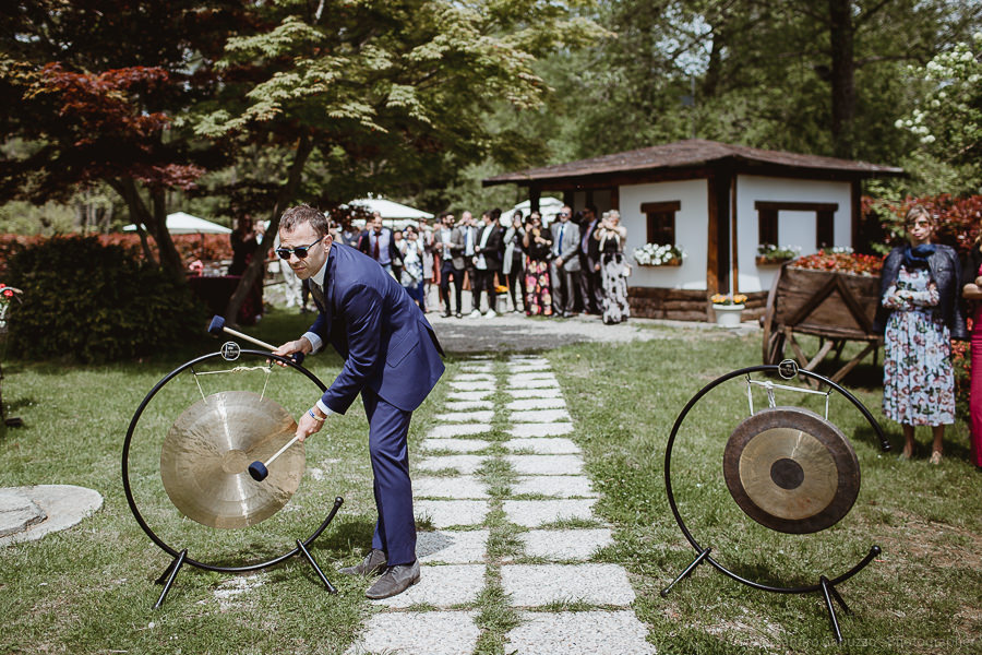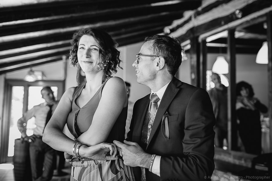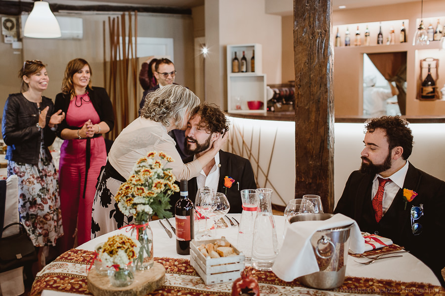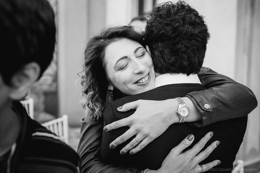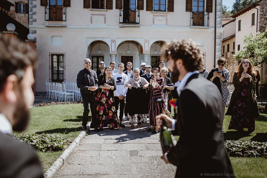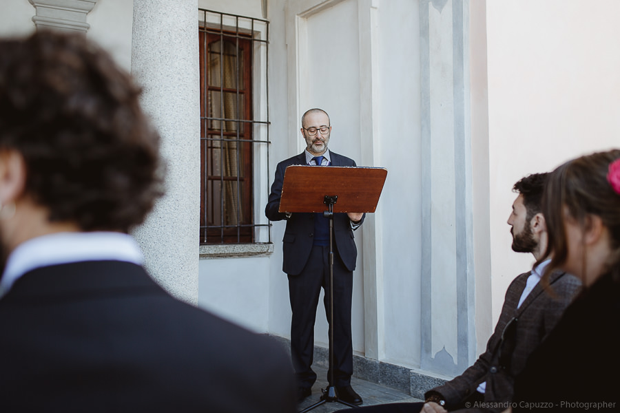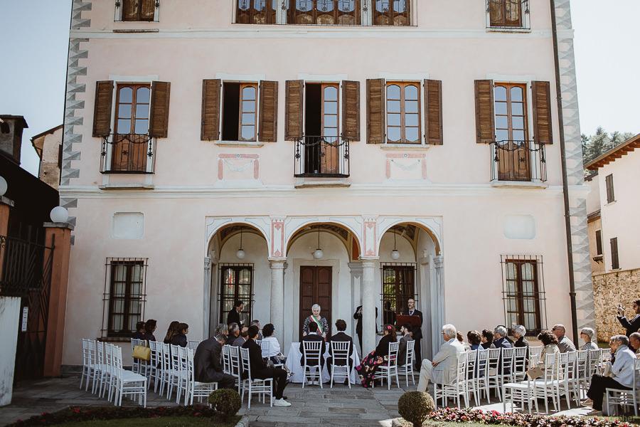 The last touches to the look of the newlyweds to be happen on the Locanda terrace, rainbow roses take their place as the boutonnières and soon after we are on our way. The couple approaches the city hall of Orta di San Giulio on a boat which allows them and their parents a grand entrance at the venue, where friends and family are waiting. After the civil rite, Daniele- one of the couple’s close friends- officiates the touching moment of the exchange of the rings accompanied by the melodic string music by “Emanuela Campagnoli”.