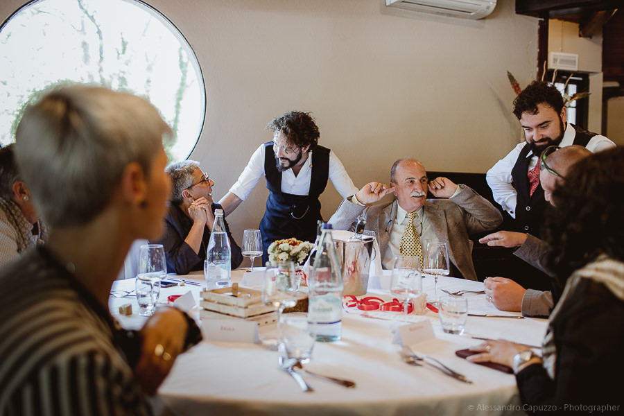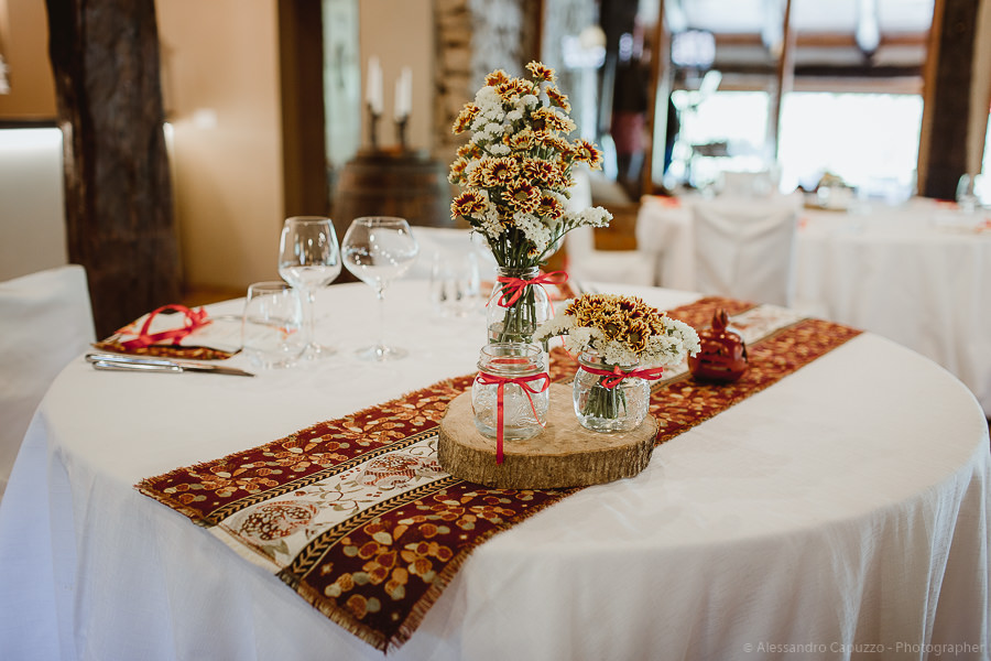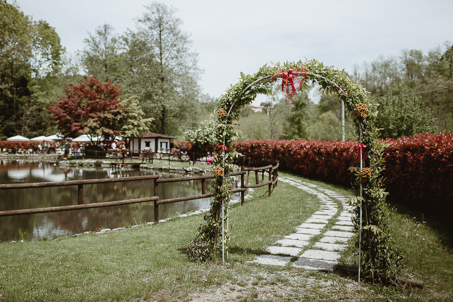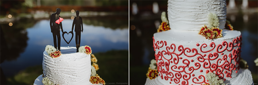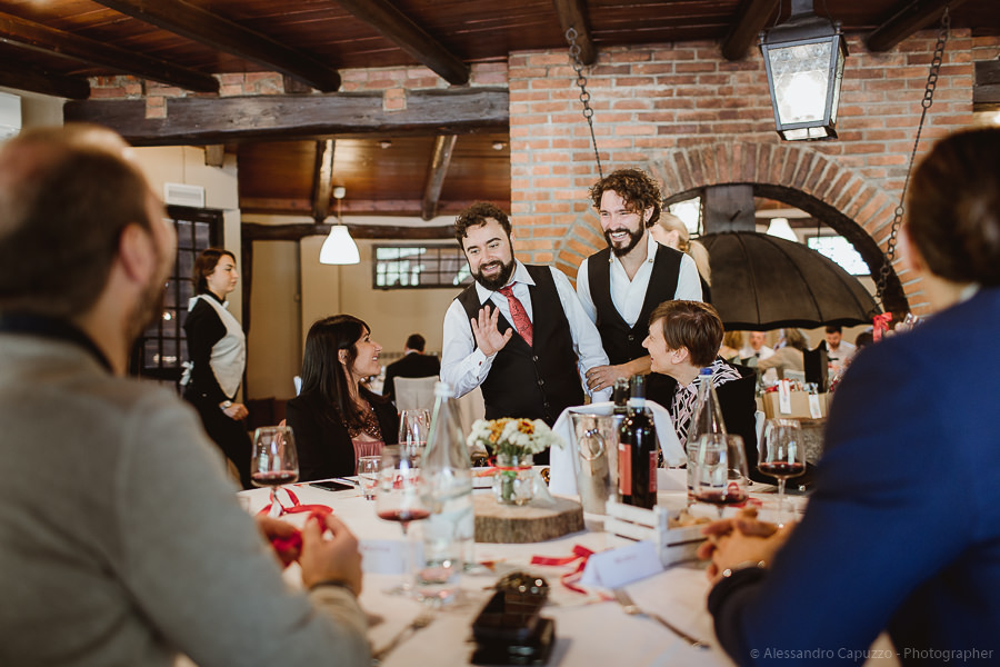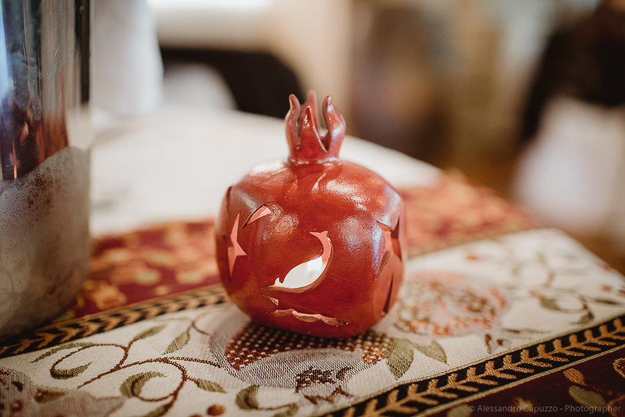 The reception takes place at “Ristorante il Laghetto della Gelata”. On the table there is a pomegranate, an important symbol for the couple as it’s tightly bound with their love story. On their terrace at home, Luca and Tiziano have a pomegranate tree. For quite some time, despite summer having arrived, it hadn’t been producing neither flowers nor fruits. That same year the couple went on holiday to Sardinia, Luca’s homeland. Both boys had independently decided that that was the perfect occasion to propose to the other… and so it happened! Once back in Milan, they found their pomegranate tree magically full with buds; a universal symbol of blessing, breathing new life into their relationship as only Love can do. Thus of course, it is not down to chance that on their special day Luca is wearing two traditional and auspicious Sardinian pomegranate-shaped buttons on the collar of his shirt.